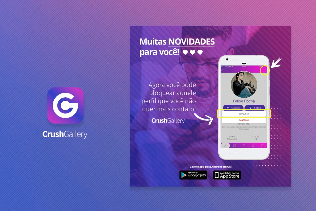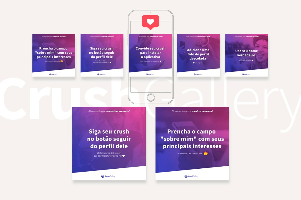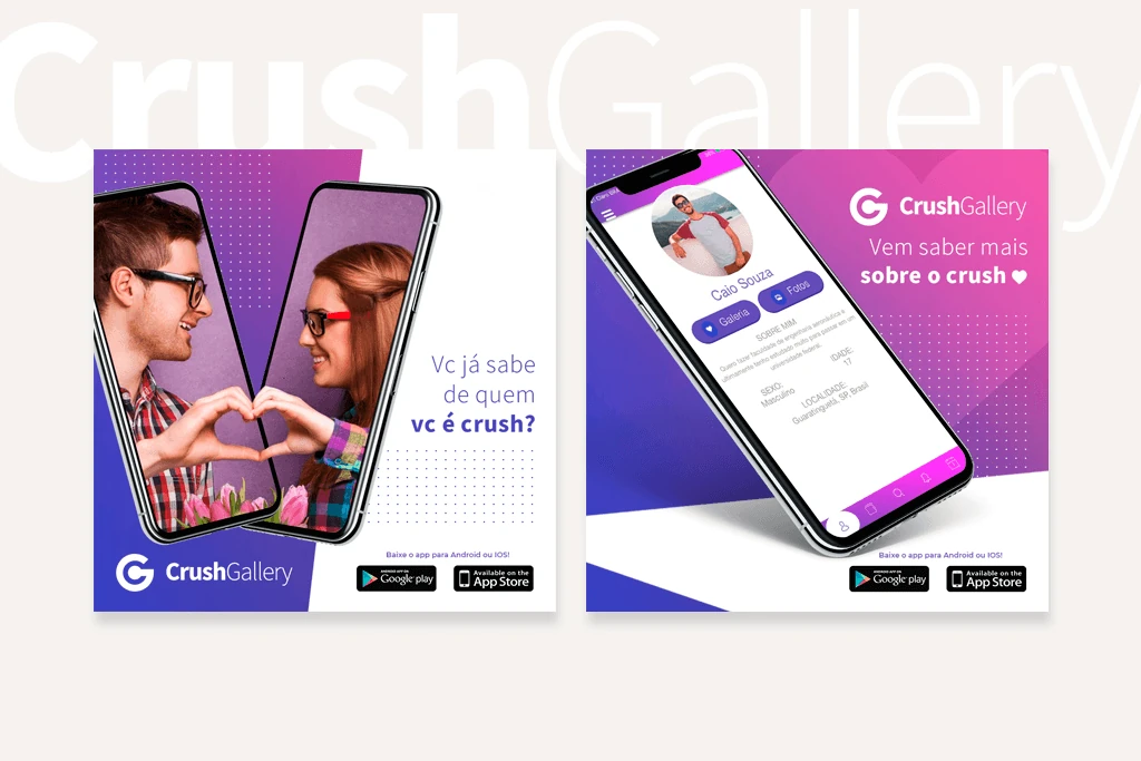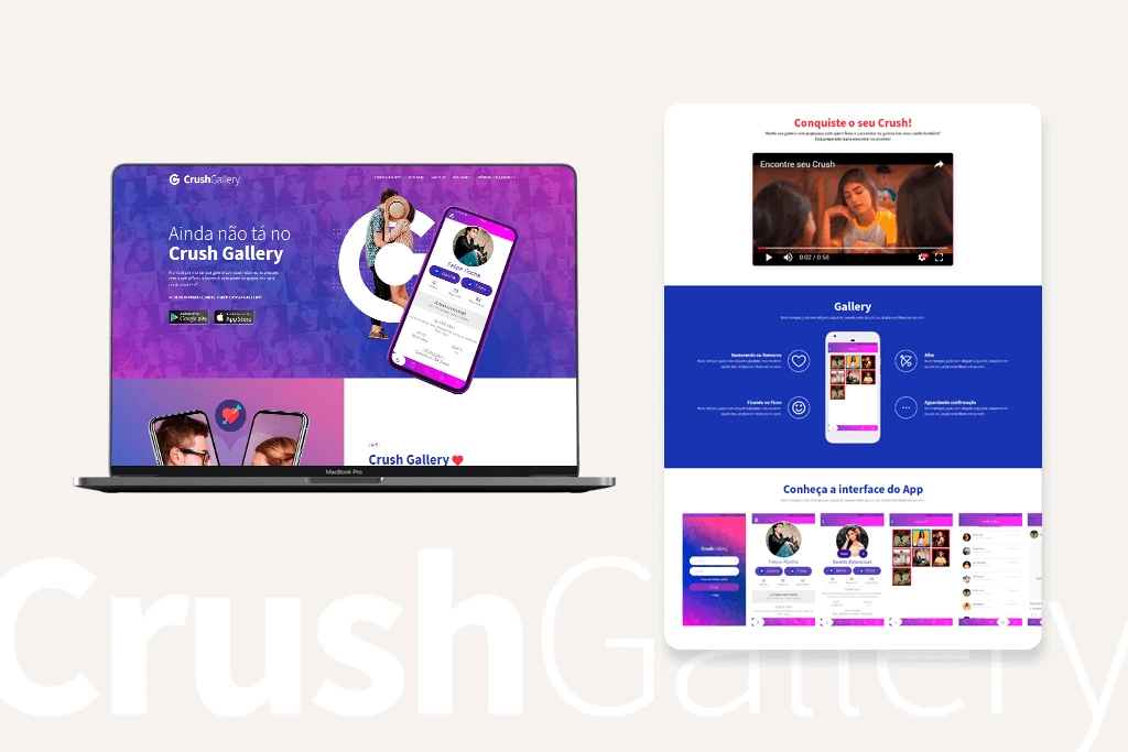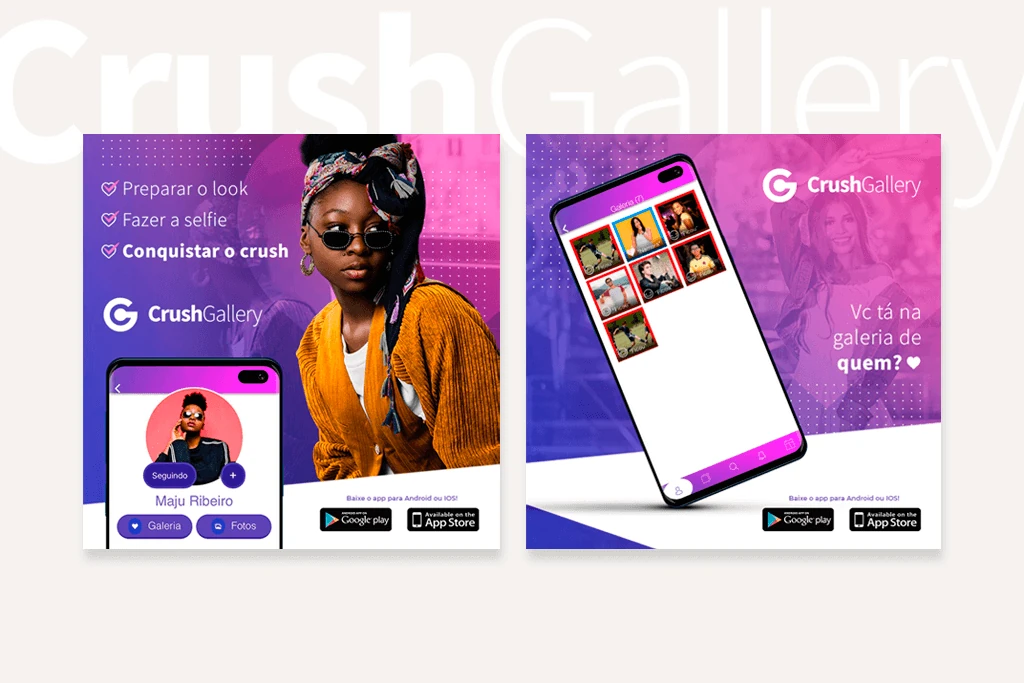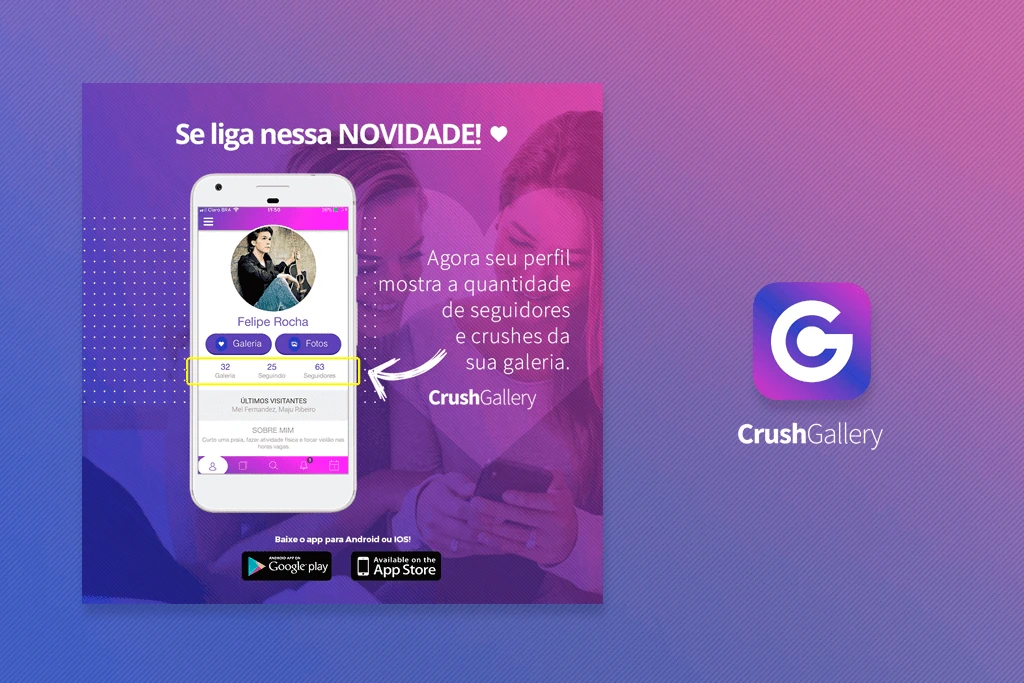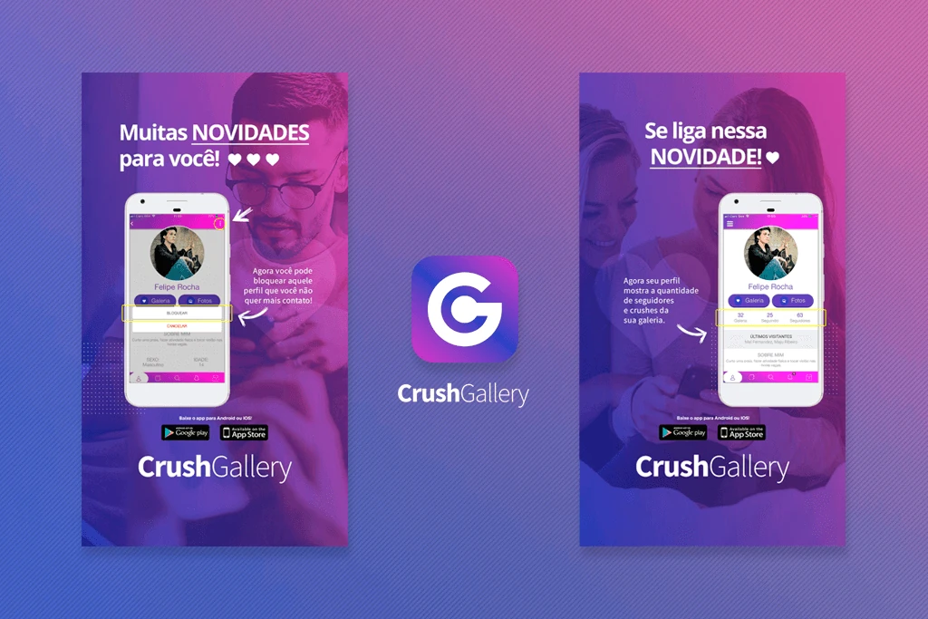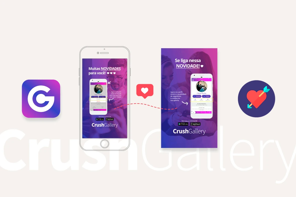 O Crush Gallery é um app desenvolvido para jovens criarem suas galerias sobre suas vidas amorosas e relacionamentos, para saber tudo o que está rolando entre os crushs e toda a galera. Saber segmentar o público que iríamos atingir, saber ouvir o que os números e a própria opinião dos usuários pôde trazer, somados ao senso de criar algo inovador, trouxe grandes resultados para o Crush Gallery, que alcançou números extraordinários de downloads do app e visualizações do vídeo.